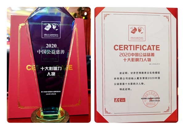 甘肅藝博教育文化傳播股份有限公司董事長戴東老師受邀參加此次論壇,并獲得“2020年中國公益慈善十大影響力人物”,授予證書與獎杯。盧永鋒總經理代表戴東老師出席論壇并上臺領獎。會后,盧永鋒總經理接受了媒體采訪,向媒體介紹了甘肅藝博教育這14年來為慈善事業(yè)做出的貢獻及未來的發(fā)展。