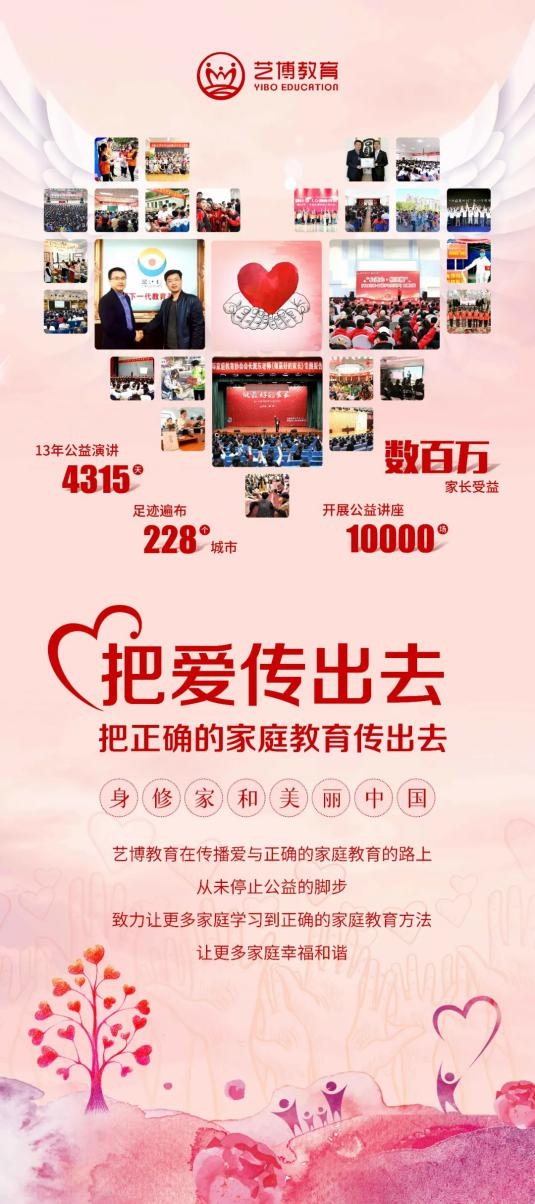 為普及家庭教育基礎知識,關愛幫扶留守兒童,受各地婦聯、教育局邀請,藝博專家講師團在全國貧困地區(qū)還進行了家庭教育公益巡講活動,公益巡講活動在全國貧困地區(qū)開展近200場,覆蓋6個省、21個地區(qū),受眾近3萬余人;