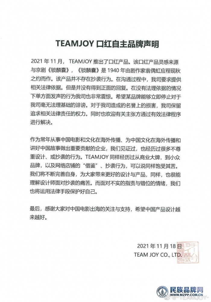 TEAMJOY還表示,希望某品牌(華)立即停止無法律依據(jù)的誹謗。面對(duì)虛假的指控和錯(cuò)位的情緒,TEAMJOY表示會(huì)用法律手段保護(hù)自己?!巴瑫r(shí),也歡迎相關(guān)倡導(dǎo)者通過有效的法律程序解決問題。”