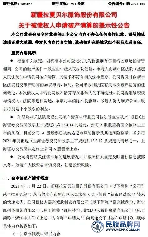 11月22日,*ST  La  Chapelle發(fā)布公告稱,公司從烏魯木齊新區(qū)人民法院獲悉,嘉興程心服裝有限公司等3家公司提交《破產(chǎn)申請(qǐng)書》申請(qǐng)對(duì)La  Chapelle進(jìn)行破產(chǎn)清算。
