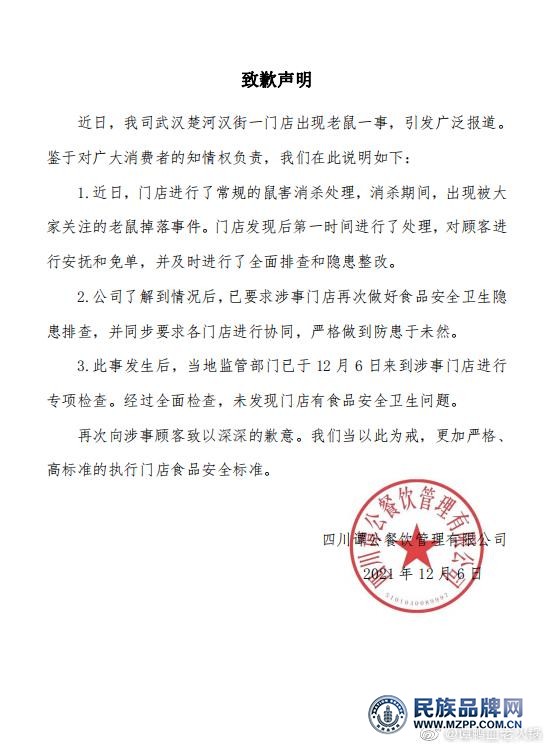 對(duì)此,12月6日晚,@譚鴨血火鍋微博針對(duì)武漢楚河漢街某店發(fā)生老鼠事件發(fā)表道歉聲明。