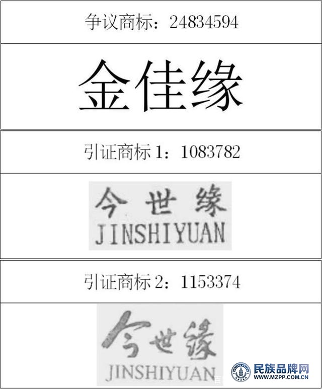 爭(zhēng)議商標(biāo)由三個(gè)宋體漢字“金家園”橫向排列;引文商標(biāo)1由漢字“金世元”和拼音“金世元”上下排列而成,采用楷書(shū)。爭(zhēng)議商標(biāo)和引用商標(biāo)1在字體上有明顯區(qū)別,只有最后一個(gè)漢字“邊”相同,而另外兩個(gè)漢字不同,差異率高達(dá)66%。同時(shí),結(jié)合商標(biāo)的實(shí)際使用情況,“金”和“金”兩個(gè)商標(biāo)在筆畫(huà)數(shù)和筆畫(huà)位置上完全不同,應(yīng)當(dāng)認(rèn)定爭(zhēng)議商標(biāo)與引用商標(biāo)1在外觀上存在差異。