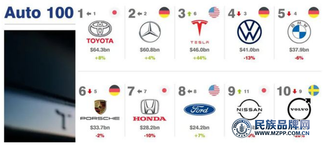 英國品牌評估機(jī)構(gòu)Brand Finance每年調(diào)查5000個(gè)品牌,發(fā)布約100份報(bào)告,對所有行業(yè)和國家的品牌進(jìn)行排名。2022年出版的《全球汽車行業(yè)品牌報(bào)告》(汽車工業(yè)2022)列出了“2022全球最具價(jià)值汽車品牌100強(qiáng)”榜單。其中豐田“衛(wèi)冕冠軍”和特斯拉的增加值最大,同比增長44%!