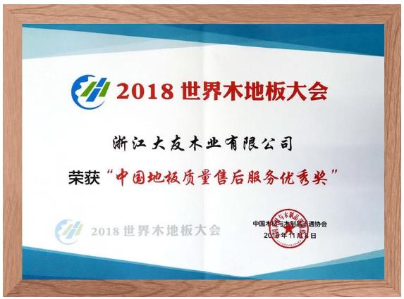 2018年11月8日,2018年世界木地板大會(huì)暨第五屆南太湖論壇隆重召開,大會(huì)進(jìn)行了多項(xiàng)重量級(jí)的頒獎(jiǎng),大友地板突出重圍,榮獲中國(guó)地板質(zhì)量售后服務(wù)優(yōu)秀獎(jiǎng)。